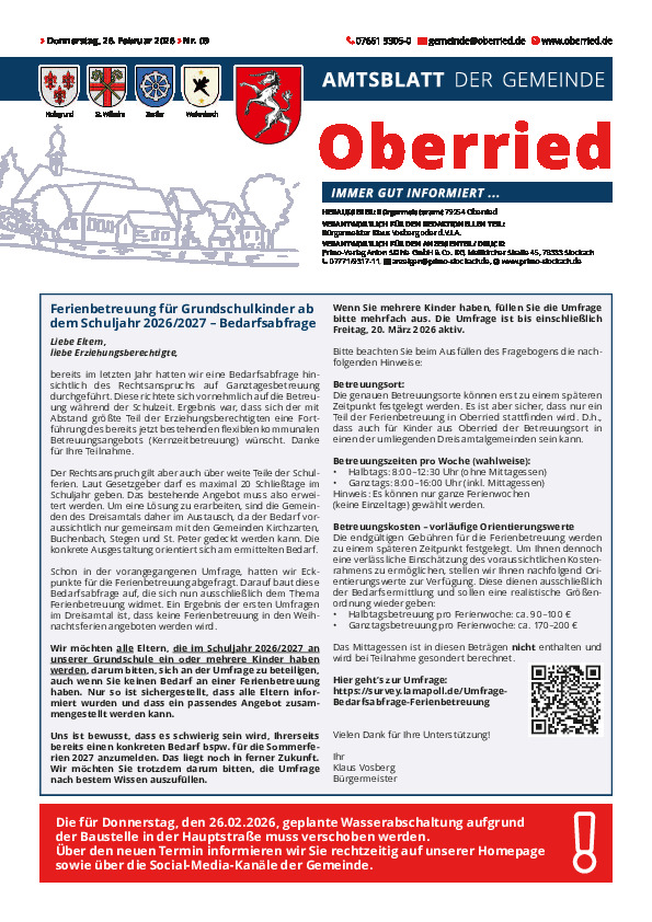 Wichtiges Update: Die für Donnerstag, den 26.02.2026, geplante Wasserabschaltung aufgrund der Baustelle in der Hauptstraße muss verschoben werden. Voraussichtlich neuer Termin ist der Donnerstag, 05.03.2026. Über Änderungen informieren wir Sie rechtzeitig hier auf unserer Homepage sowie über die Social-Media-Kanäle der Gemeinde. Betroffen sind die Bereiche Obertalstraße, Schmiedegasse und Hauptstraße (von Bauhof bis Dorfschänke).