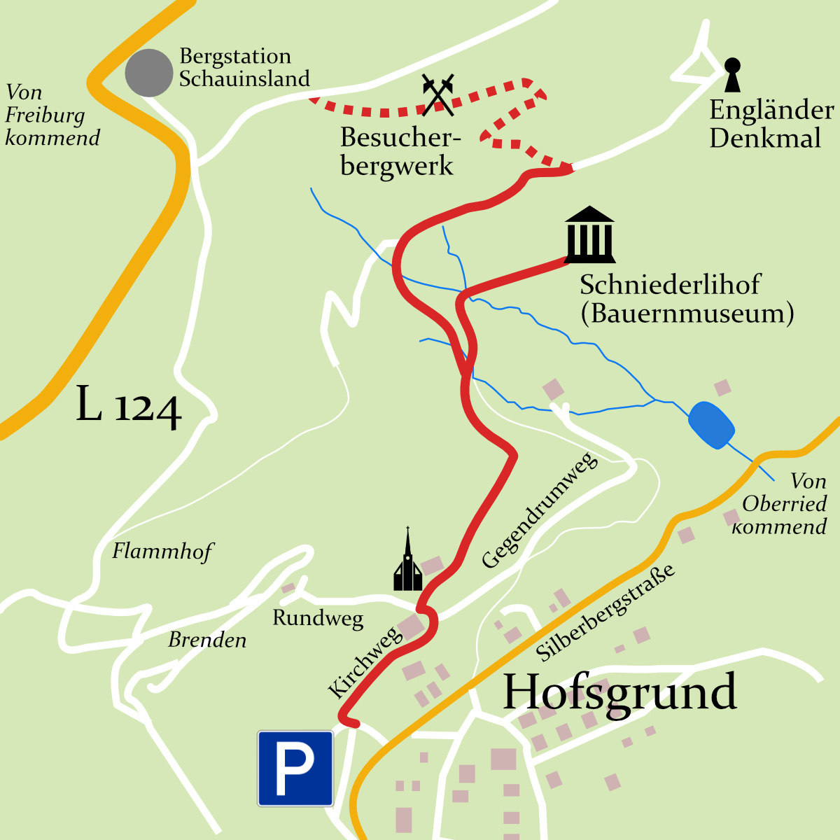 Innerorts gibt es einen großen Parkplatz. Von der Kirche aus führt ein beschilderter, leicht zu begehender Fußweg (750 m) zum Schniederlihof. Man kann auch von der Passhöhe der Schauinslandstraße (vorbei am Bergwerkseingang) in etwa zwanzig Minuten zum Schniederlihof hinabsteigen.